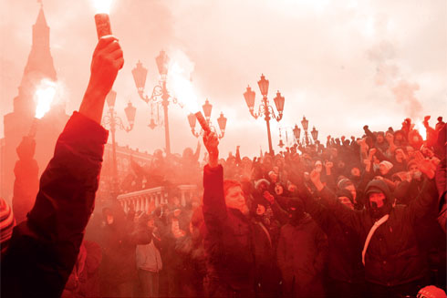 «То, что вы сейчас видите, происходит в центре Москвы, на Манежной площади, в эти минуты. Около 50 тыс. футбольных фанатов* собрались на несанкционированный митинг» — так 11 декабря 2010 года ведущая государственного телеканала комментировала то, что потом СМИ назовут «грандиозной бойней» и «погромом на Манежной». Дальше видеоряд: вся площадка над торговым центром «Охотный Ряд» забита людьми — у многих лица закрыты шарфами и медицинскими масками. Дым. В небо летят сигнальные ракеты и петарды, горят файеры. Под ногами — куски арматуры, лед, камни, битые елочные игрушки. Протестующие строят баррикады из металлических ограждений. Толпа скандирует: «Москва — русский город!» Омоновцы группами рассредоточены по площади, митингующих выхватывают по одному. «На место прибыл глава столичного ГУВД Владимир Колокольцев <…> и заверил, что убийство их товарища, из-за которого они все здесь и собрались, обязательно будет расследовано» — этим заканчивался репортаж.