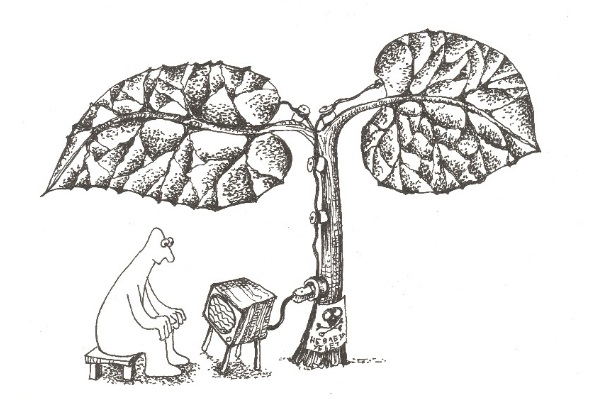 Иллюстрация Стаса Егина к учебному пособию Т.А. Пузановой "Экология". М: Экономика. 2010Большая часть изобретений базировалась на производстве биопластика из крахмала, который в избытке содержится в картофеле, кукурузе, злаковых. Но о крупномасштабном внедрении говорить пока рано, поскольку производство биопластика достаточно дорогостоящее. Кроме этого, учитывая нехватку сельскохозяйственных площадей, огромные плантации кукурузы для производства одноразовых кукурузных вилок и ножей тоже имеют обратную сторону медали.