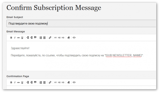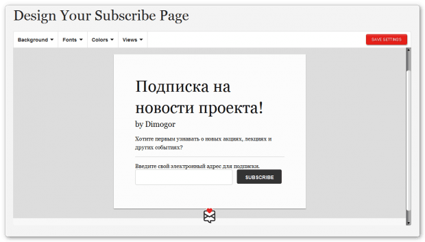 Первым делом вам необходимо обратить внимание на раскрывающееся меню Settings, находящееся в правом верхнем углу. Здесь мы можем настроить внешний вид и содержание страницы подписки. Кроме этого, в этом разделе необходимо задать сообщение о подтверждении почтового адреса, высылаемое всем новым подписчикам, а также сообщение на случай отписки. После того, как вы закончили со всеми этими техническими процедурами, можно получить адрес страницы подписки и специальный html-код, встроив который в любую веб-страницу, вы разместите на ней форму подписки.
