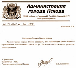 13 марта в ветке отметился заместитель главы администрации Пскова Сергей Калинкин: «Уважаемая Галина! Информация о строительстве многоэтажных домов по ул. Рокоссовского в управление по градостроительной деятельности Администрации города Пскова отсутствует».