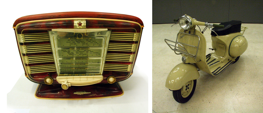 Радиоприемник "Звезда -54" - копия французского "Exelsior - 52". Из собрания Московского музея дизайна. Мотороллер "Вятка-ВП-150", сделанный по прототипу итальянского Vespa 150 GS. Из собрания Музея Индустриальной культуры.В бюллетене «Техническая эстетика», начиная с первого выпуска 1964 года, писали – эту кинокамеру сделали по аналогу финской, а надо разрабатывать своё. И со второй половины 60-х годов начинаются собственные разработки. Вот пылесос «Чайка» - первые выпуски копировали голландские пылесосы конца 30-х, а у нашей измененной версии, «Ракеты», полозья были заменены колесиками, и внутренняя оснастка поменялась. «Сатурн» - на основе американского пылесоса Hoover Constellation (1955), но вместо воздушной подушки также колеса, и создана идеальная круглая форма с ободком в духе space age, эры космических полетов. Наши пылесосы были долговечными, так как делались «в нагрузку» на предприятиях тяжелой промышленности, но кроме того большинство отечественных моделей, начиная с 1950-х работали еще и на выдувание – это было очень популярно именно у нас. Пылесос становился многофункциональной вещью, им можно было отлично побелить потолки, опрыскивать растения от вредителей и ковры нафталином – это указано и в инструкциях.