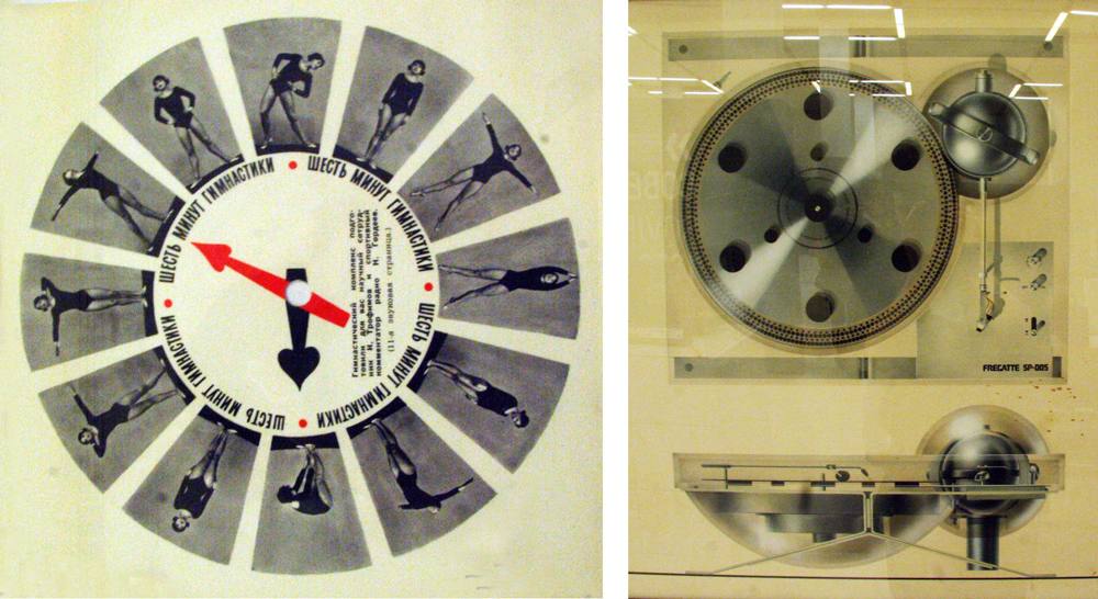 «Шесть минут гимнастики», гибкая пластинка из журнала «Кругозор». (Советский литературно-музыкальный и общественно-политический иллюстрированный журнал, с приложениями в виде гибких грампластинок. Издавался в 1964-1992 гг). Собрание музея дизайна. Перспективный проект электропроигрываетеля "Фрегат SP-005", 1979, дизайнер Н.Слесарев, из собрания семьи автора.- Развитие легкой промышленности отложили на потом, а что с тяжелой?
