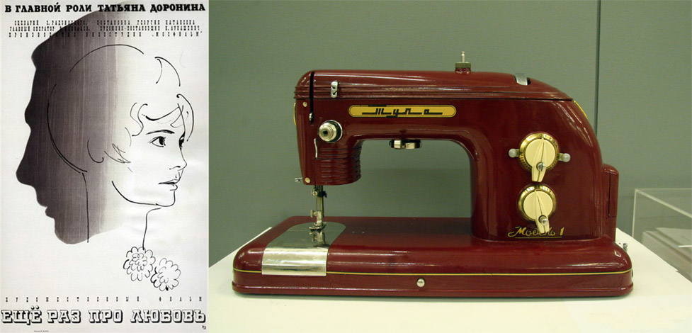 Киноплакат "Еще раз про любовь", 1968. Художник М. Лукьянов. Швейная машинка "Тула", выпуск с 1955 по нач. 80-х. собрание Московского музея дизайна.Выставка «Советский дизайн 1950-80-х» открыта до 20 января 2013 года. Записаться на экскурсии по экспозиции можно на сайте музея.