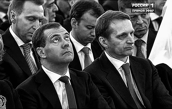 Депутат Валуев возвышается над залом и слушает, раскрыв рот. Депутат Луговой широко улыбается. Премьер Медведев закатывает глаза, не переставая краснеть.