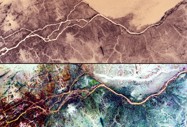 Нил. На радарном снимке (снизу) видно древнее русло Нила, засыпанное песками Фото: NASA Зонд "Кассини", с 2004-го года изучающий окрестности Сатурна, во время своего 87-го пролета над Титаном 26 сентября обнаружил в северном полярном регионе спутника реку, формой удивительно напоминающую земной Нил, точнее, его в десять раз уменьшенную копию.
