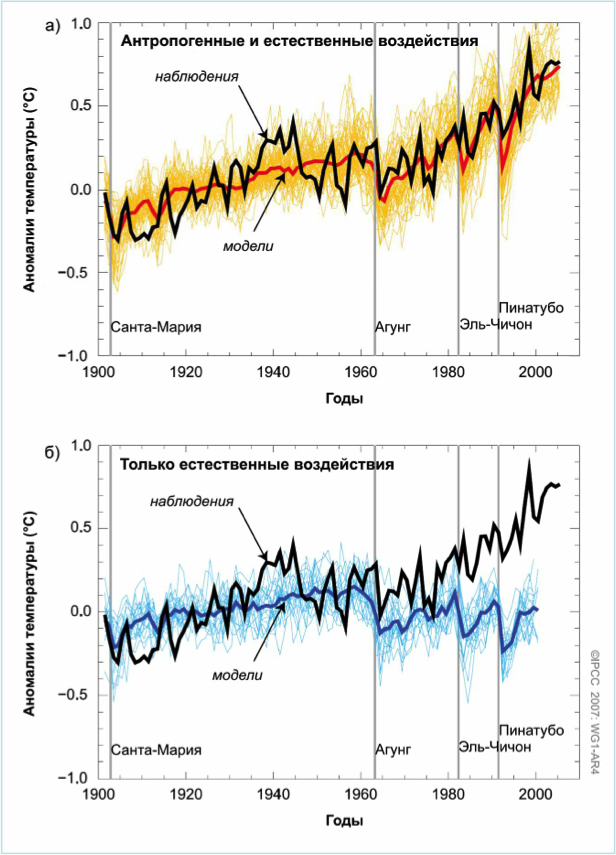 Голубая кривая показывает расчетные значения температуры без учета антропогенного фактора. Резкое отклонение от реальной кривой демонстрирует, насколько антропогенный фактор вносит более серьезный вклад, чем естественные факторы.