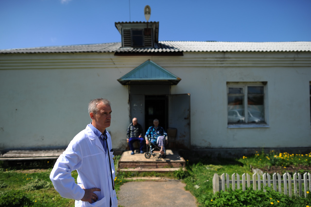 На порог беленого одноэтажного дома, в котором расположилась больница, выходит Сергей Вишняков, главный врач. На нем белый халат, поверх — черный пуховик, на шее — стетоскоп. Вишнякову 51 год, он выглядит на свой возраст — ни больше ни меньше. Коротко стриженный, русый, подтянутый, увлекается беговыми лыжами вместе с женой, блондинкой Еленой, работающей на подхвате в больнице, с нетерпением ждет каждого первого снега.