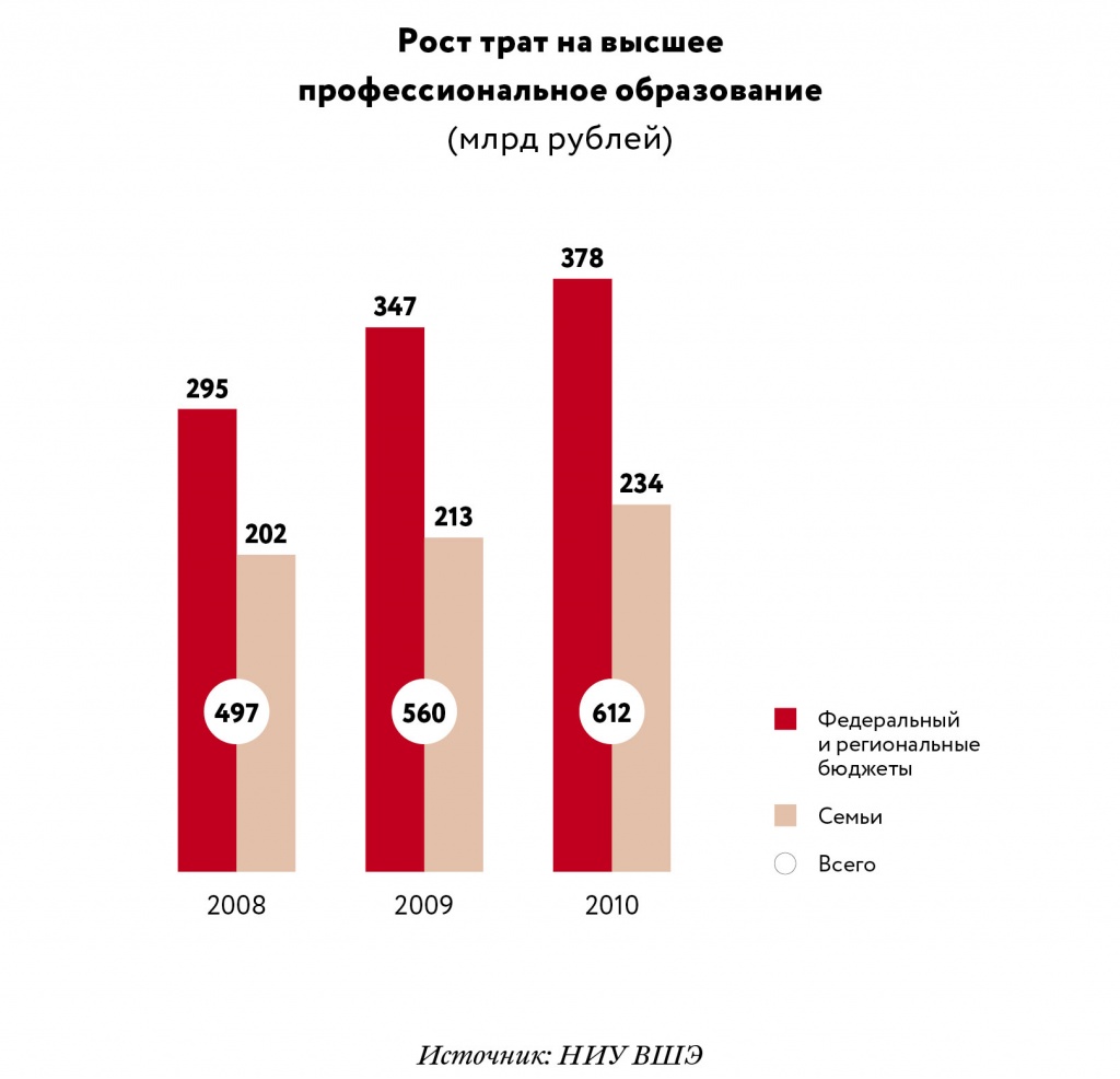 Стоимость образования в России приближается к его стоимости в приличных западных университетах. Например, один семестр обучения на юриста в City University Нью-Йорка обходится резидентам штата в $6900 (для нерезидентов, то есть для тех, чьи семьи не платили в штате налоги, — $10 900). А год обучения на бакалавра в миланском университете Боккони стоит $6050–13 500. В результате семьям со средним и высоким достатком приходится задуматься: платить российским вузам или же отправить чадо в университет за границу — образование в вузах второго ряда там не хуже, а цены ниже. Хотя, конечно, Гарвард, как и другие университеты первой тридцатки, пока абсолютному большинству не по зубам: год вместе с расходами на учебники и жизнь там обойдется в $50 тыс.
