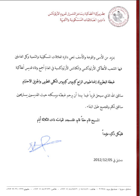 Уведомление о смерти предыдущего патриарха Сулейман добавил также, что это арабские лидеры должны сплотиться, чтобы сохранить присутствие меньшинств в своих государствах, потому что «христиане являются учредителями арабского Ренессанса в этих странах». «Христиане в Ливане должны также защищать свой статус, чтобы избежать влияния заграничных событий на их сообщества», - добавил президент. «Ранее мы уже заплатили за не-демократические порядки в регионе. Мы должны сегодня быть осторожными, чтобы не платить цену за демократию других», - добавил он. Отвечая на вопрос о текущем политическом кризисе в Ливане, президент Сулейман сказал, что он настаивает на проведении национального флоума, чтобы урегулировать разногласия между противоборствующими сторонами.