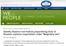 В интернете начался сбор подписей за включение депутатов Госдумы, поддержавших антисиротский закон, в "список Магнитского". Петиция с этим требованием размещена на сайте Белого Дома. Чтобы обращение было рассмотрено, до 20 января необходимо собрать 25 тысяч подписей. Подписать петицию могут как американцы, так и граждане других стран.