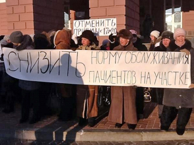 Врачи пришли на пикет, несмотря на 25-градусный мороз. В руках медики держали плакаты с призывом сократить их трудовую нагрузку: "Невыносимо работать на двух участках! И дети страдают, и мамы!", "Долой очереди в детские поликлиники!" и "Хватит принуждать работать врача на двух участках за символическую плату!", передает РИА "Новости".