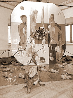 Наиболее вызывающе выглядит композиция, разместившаяся в Доме Сафьянщикова в бывшей мастерской псковского художника Эдуарда Шарипова.