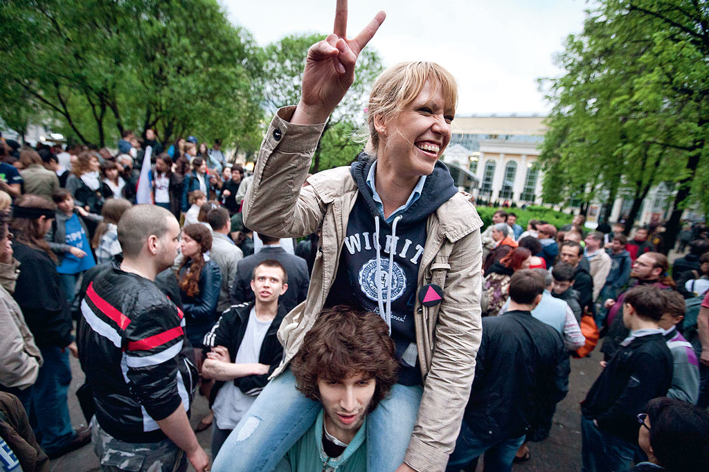 Почему выбрали Чистые пруды? Активистка РСД Изабель Магкоева утверждает, что эта мысль пришла в голову ей: «Там был концерт ветеранов, а от памятника героям Плевны людей быстро выдавили. Мне показалось, что на Чистых прудах, где гуляют старики и дети, нас никто не тронет». Лагерь на Чистых прудах продержался неделю; я приходила туда три дня подряд и умилялась всему, что видела. Мне нравились анархисты, следившие за кухней. А эти «зеленые», убиравшие за собой мусор! Националисты не нравились, но можно их потерпеть, мы же все бьемся против общего врага — ну этого, трижды коронованного, въехавшего в Кремль на белом бронированном коне.