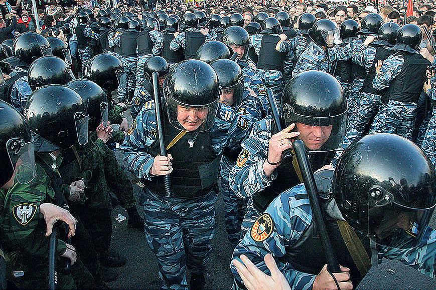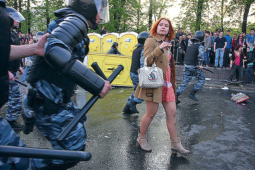 В омоновцев постоянно летели горящие файеры, они их поднимали и швыряли обратно в толпу. ОМОН работал дубинками, забирал демонстрантов, люди отбивали задержанных. Конфликт нарастал, и стали вписываться «кузьмичи» — дядьки простые, которые стояли и охреневали. Задержали меня так: я снимаю и вижу, как к важному товарищу в звании, кажется, полковника подбегает дедок и кричит: «Что вы делаете, это противозаконно, что ваши бойцы делают?!» В ответ от офицера он получает пинок со словами в духе: «Если не хотите получать, надо было дома сидеть». Только он это грубо и с матом сказал. Тут-то я и всунул свой комментарий: «Вы офицер или кто?» По его приказу меня задержали. Отпустили, когда пресс-карту показал.