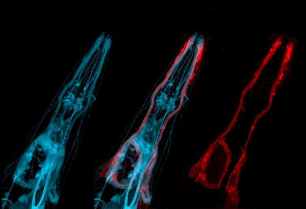 Голова нематоды Caenorhabditis elegans. Нейроны обозначены красным и синим Фото: Marine Biological Laboratory 10-15 лет назад появилось новое течение, которое стало пытаться смоделировать поведение животных и получило название поведенческая роботика или «аниматы» - это сочетание двух слов (animal и automat) - и здесь очень широко стали применяться эволюционные методы. Цель этих исследований – не пытаться сразу понять интеллект человека, а сначала попробовать разобраться с интеллектом животных. На этом пути были получены интересные результаты. Можно сказать, что появилось целое направление в искусственном интеллекте, которое принесло свои плоды.
