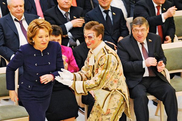 Фото: Дмитрий Духанин/Коммерсантъ После того, как сенаторы Совета Федерации единогласно приняли "антимагнитский" закон с "антисиротскими" поправками, перед ними выступили артисты "Геликон-оперы". В красочных костюмах они пели сенаторам арии из опер и оперетт и песни Исаака Дунаевского и Анатолия Лепина.