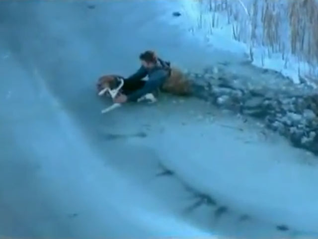 BBC уточняет, что в службу спасения 911 позвонил владелец собаки, не сумевший помочь своему домашнему питомцу, потому что ломающийся лед не давал ему подступиться к краю полыньи.