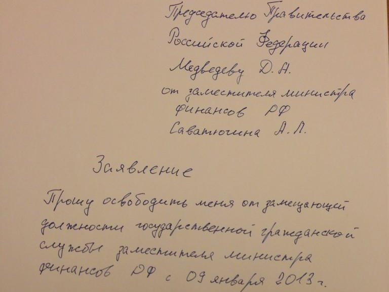 Саватюгин просит премьера освободить его от должности замминистра финансов с 9 января 2013 года. Он не поясняет причины своего решения, однако копия заявления сопровождается записью: «Последний год меня почему-то многие (и друзья, и журналисты) об этом спрашивали. Ну так вот ответ». Саватюгин подписал заявление 28 декабря 2012 года.