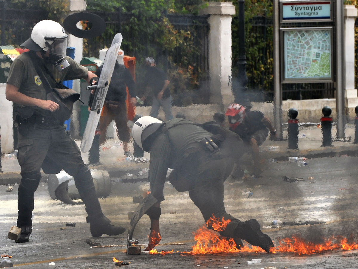 Полицейский в Афинах 5 мая - во время акций протеста против мер экономии Рецессия, бюджетный дефицит, кризис евро, региональный сепаратизм, конец социальной модели государства, возвращение секса в большую политику – главные, по мнению авторов Проекта Европа, темы 2012 года. Впрочем, в конце обсуждения участники Проекта Европа пришли к выводу, что самое важное слово 2012-го – даже не "разочарование", а "переосмысление".