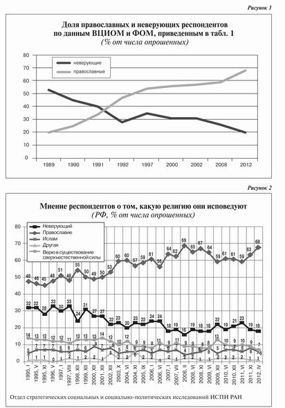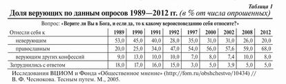 50—60 % к 1995 году. Соответственно снизилось число неверующих (атеистов) с 50 до 30 % (табл. 1, 2). Некоторые социологические опросы показывают, что число респондентов, называющих себя православными, особенно резко выросло в 1991—1992 годах. Возможно, это связано с крушением Советского Союза, когда у людей возникла потребность взамен исчезнувшей обрести новую идентификацию, как-то себя определить. Поскольку они перестали быть советскими, они снова стали русскими, а «русские — значит православные».