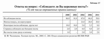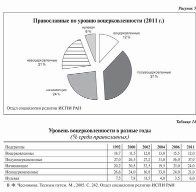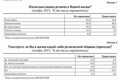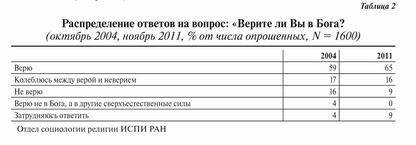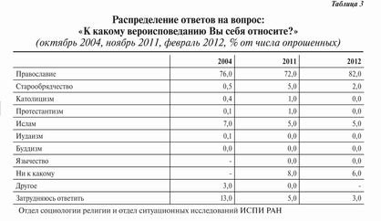 С нашей точки зрения, полученные данные говорят об определенной стабилизации роста доли православных респондентов. Исследование 2011 года подтвердило отмеченную многими особенность религиозной ситуации в России: доля респондентов, относящих себя к православным, превышает долю тех, кто считает себя верующим. Это означает, что часть неверующих граждан считают себя принадлежащими православной культуре и в этом смысле православными. 8 % респондентов не относит себя к какой-либо конфессии. Большую часть этой группы составляют неверующие — 68 %, колеблющиеся — 7 %, верующие — 4 %. Таким образом, верующие вне конфессии — это пока очень небольшая группа.