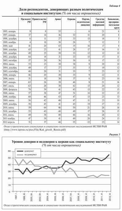По данным совместного опроса Отдела социологии религии и Отдела ситуационных исследований ИСПИ РАН в июле 2012 года доверяли церкви 62 % опрошенных, не доверяли 25 %, затруднились ответить 13 %. Патриарху Кириллу доверяли 56 %, не доверяли 24 %, затруднились ответить 20 %9.