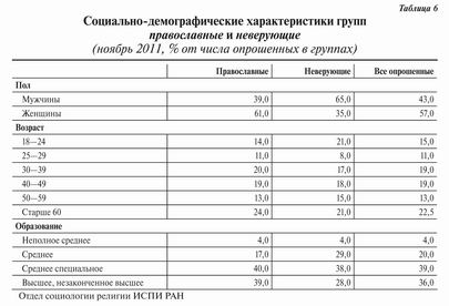 В группе православные 39 % мужчин и 61 % женщин (табл. 6), что не очень сильно отличается от среднего распределения по массиву — 43 % мужчин, 57 % женщин — и по всему населению (согласно последней переписи на 45 % мужчин приходится 55 % женщин). В 1992 году мужчины составляли 29 % православных респондентов, так что можно говорить, что за последние 20 лет половая структура группы православные изменилась существенно. Уровень образования у православных несколько выше, чем в среднем по массиву. У них выше, чем у неверующих, доля имеющих высшее образование, что опровергает устоявшийся миф о малообразованности православных. Самой же образованной группой согласно всем исследованиям последних 20 лет являются воцерковленные православные (доля опрошенных с высшим образованием в этой группе в 2011 году составила 44 %, в том числе более 3 % имели научную степень). В целом социально-демографические характеристики группы православные совпадают со средними данными по массиву. Следует обратить внимание на то, что в группе неверующие самая высокая доля молодых людей — от 18 до 24 лет, а также на то, что неверующие — единственная группа с преобладанием мужчин.