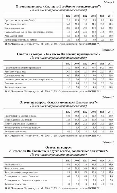 Исследования 2004 и 2006 годов показали, что из пяти показателей воцерковленности превалируют посещение храма и молитва. Данные исследования 2011 года демонстрируют некоторое снижение доли православных, молящихся церковными молитвами, а также регулярно читающих Евангелие. Процент регулярно посещающих храм остался практически неизменным. Зато выросла доля тех, кто регулярно причащается, а это важный показатель воцерковленности. Пост в данном отношении не столь показателен, тем не менее следует отметить, что доля не соблюдающих посты существенно снизилась. По всем показателям снизилась также доля респондентов, которые выбрали «нулевую» позицию — никогда не были в храме, никогда не причащались, никогда не молились, никогда не читали Евангелие, никогда не постились. Особенно заметно снизился процент не молящихся — с 52 % в 1992 году до 20 % в 2011-м, а также не соблюдающих посты — с 86 % в 2000 году до 55 % в 2011-м.