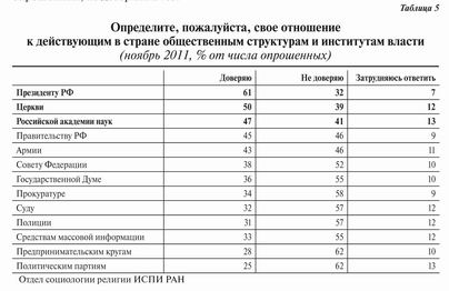 Данные исследования Отдела социологии религии ИСПИ РАН 2011 года демонстрируют несколько более высокий уровень недоверия к церкви, чем другие исследования, а также рост уровня недоверия по сравнению с 2006 годом. В 2011 году церкви как социальному институту доверяли 50 % опрошенных, не доверяли 39 %, затруднились ответить 12 %. В 2006 году доверяли церкви 51 % всех опрошенных, не доверяли 24 %.