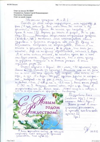 Что за люди собрались в доме, почему началась стрельба, их имена – все эти детали происшествия пока не разглашаются. Инцидент произошел в шести километрах от кинотеатра, где полгода назад на сеансе очередного "Бэтмена" 24-летний Джеймс Холмс расстрелял зрительный зал, оставив 12 трупов. 13:03 6.1.2013 Пошел 23-й день голодовки фигуранта "болотного дела" Сергея Кривова. В Новый год родные получили он него письмо, в котором он поздравлял всех с праздниками и был полон оптимизма. Письмо было выставлено в фейсбуке в группе "Голодовка Сергея Кривова в СИЗО", поэтому могу привести его здесь тоже.