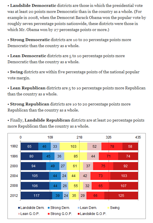 Один из сильнейших экспертов в области электоральной статистики Нэйт Силвер указывает, что с 1992 года число конгрессменов из округов с огромным преимуществом одной из партий резко выросло – с 65 до 117 у демократов и с 58 до 125 у республиканцев (всего в Палате представителей 435 конгрессменов).