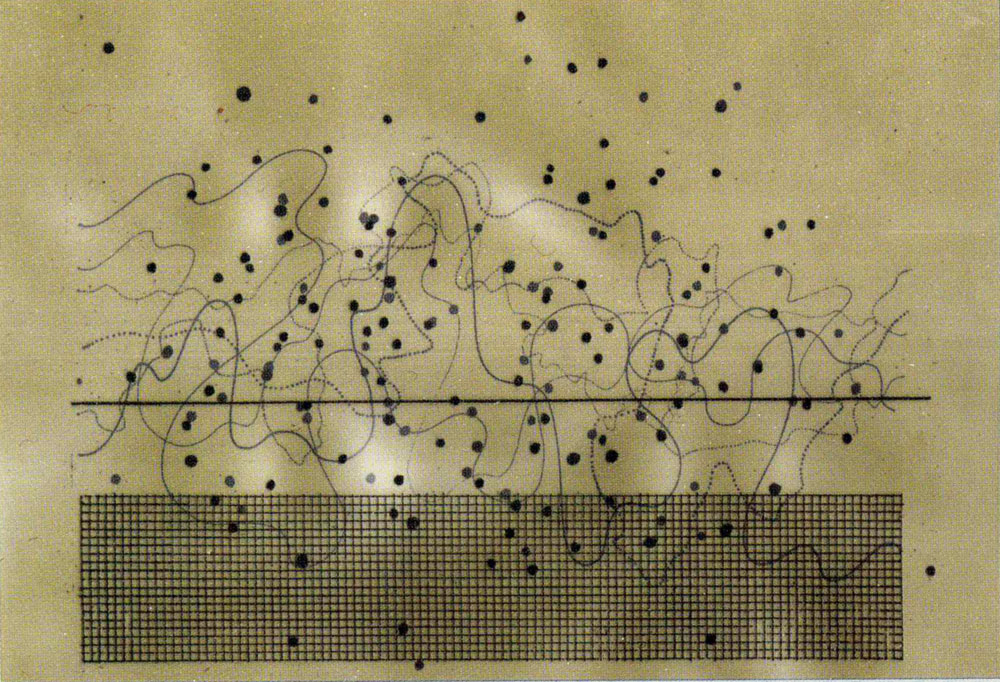 Марсель Дюшан, офорты из серии «Большое стекло и работы этого цикла», 1967-68. Из коллекции Бориса Фридмана. Случайность в русской спецификации показана концептуалистом Вадимом Захаровым в его работе «Бах. Посвящение Кейджу» на выставке в «Екатерине». Чисто случайно 4 минуты 33 секунды оказываются равны 273 секундам – Захаров пишет два этих числа с наложением одно на другое, а к ним в авоське подвешивает магнитофон с 273-им хоралом Баха, с которым Кейджа сравнивали. Из названия работы Захарова получается, что человек из прошлого посвящает произведение человеку, который еще не родился. Как в упомянутой Кейджем истории художник Виллем де Кунинг в ответ на вопрос о том, кто из художников прошлого больше всего на него повлиял, сказал: «Прошлое не оказывает на меня ровно никакого влияния. Я сам влияю на него». Авоська от «авось» - воплощение случая. Также авоська – это мягкая клетка, а перевод фамилии Cage на русский язык – именно «клетка». В авоське - магнитофон с записью Баха, правда, когда я смотрела выставку, он был выключен – то ли смотритель забыл включить, то ли автор так задумал, это гадательный момент.