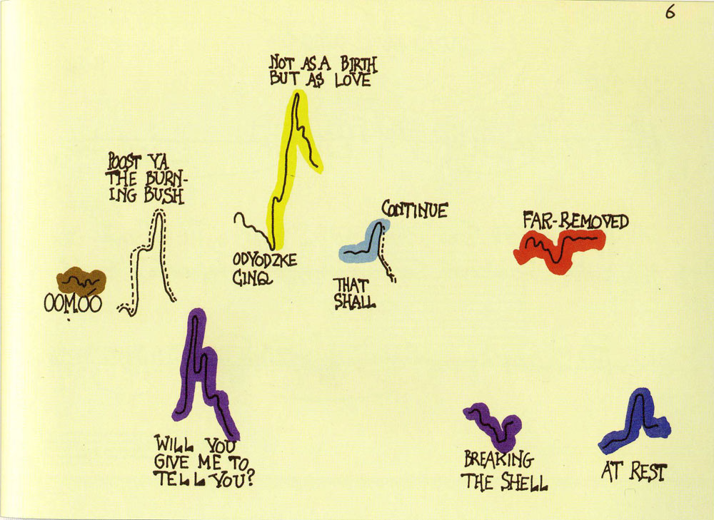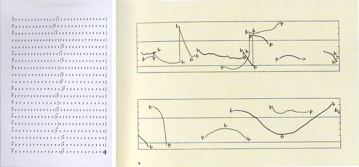 В партитуре появляются черные квадраты – это «любые шумы», как то: шаги, залаяла собака, пальцы нервно (или нагло) барабанят по столу, болезненный вдох, мирный выдох, крик (как будто увидел мышь), йоху (как будто американский индеец), выдохнуть, как будто оргазм. Это уже драматургия, почти театр, и поскольку шумы «любые» – исполнитель сам выбирает последовательность из вариантов, создавая сюжет. Прилагается текст на пяти языках: армянский, русский, французский, английский, итальянский. Можно представить себе, сколько творческого труда в интерпретации партитур приходилось вкладывать исполнителям. Неудивительно, что они иногда бунтовали.