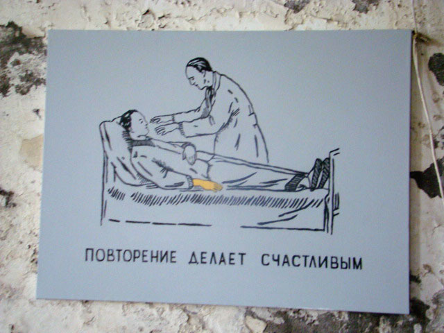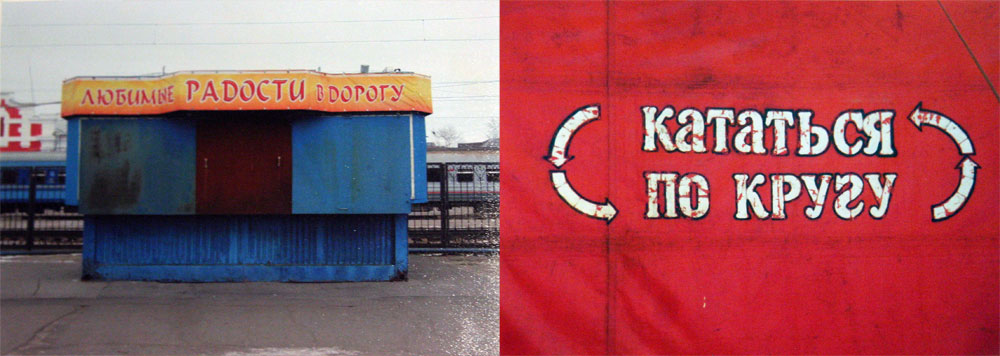 Герман Титов, из проекта «Русские корни буддизма», 2012 Пустотности на выставке хоть отбавляй, причем самой что ни на есть документальной. На фотографиях - заброшенные пустыри за домами, серое промозглое небо, сломанный автобус с запорошенными снегом сиденьями, и ларек «Товары в дорогу», окна которого закрыты металлическими щитами. В жизни вся эта неустроенность раздражает и доводит до отчаяния, но в буддийской трактовке Титова приобретает какой-то возвышенный и героический смысл – путнику на дороге Махаяны никакие товары не понадобятся. Прямая ли это дорога? В серии холстов параллельные линии на белом фоне проходят из холста в холст и постепенно искривляются синусоидами, сплетаясь в орнамент. Это не рельсы – линий пять, скорее партитура. Сам Титов полагает, что смотреть холсты нужно как текст, слева направо, читая как переход от хаоса к обретению спокойствия. Но если воспринимать пространственно, от входа в глубину зала – то получается наоборот и тоже интересно. От мира непреодолимых законов, в котором параллельные линии не пересекаются, а каждое существо обречено на одиночество в собственной судьбе – к парадоксальной ситуации, в которой линии неоднократно встречаются, а все живое оказывается взаимосвязанным.