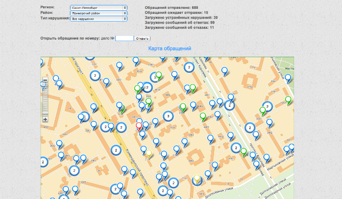 Движение «Красивый Петербург» появилось этим летом после массовой фотопрогулки, во время которой активисты фотографировали нарушения на улицах города. Сейчас на сайте «Красивого Петербурга» можно указать один из более 40 типов нарушений: от незаконной свалки и открытого люка до отсутствия пешеходного перехода и сомнительной наружной рекламы. Чтобы отправить обращение, надо лишь вписать в готовый текст адрес и свои данные.