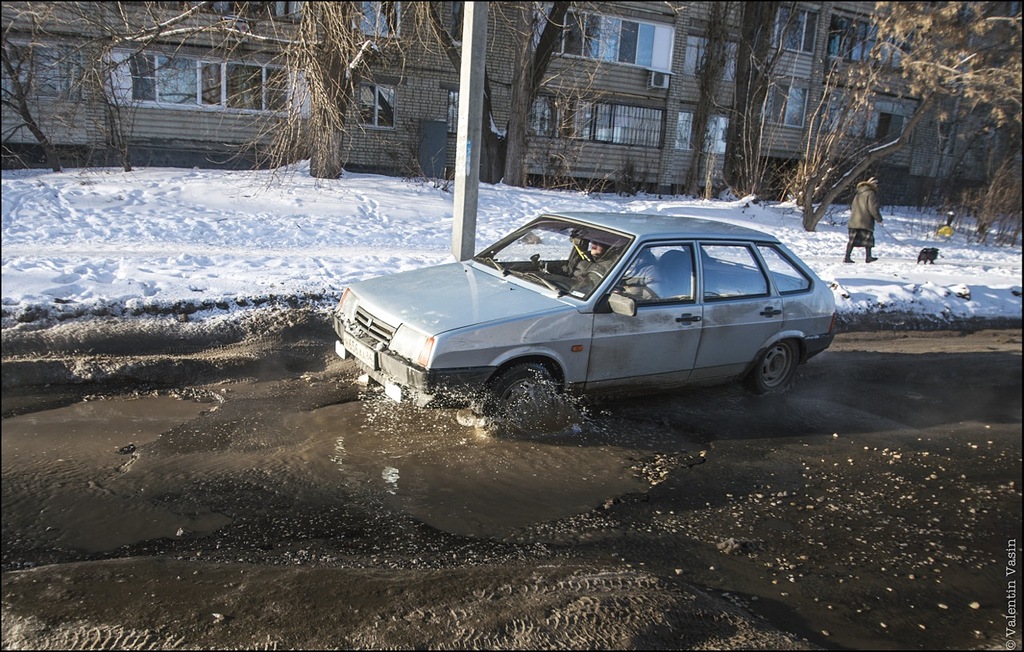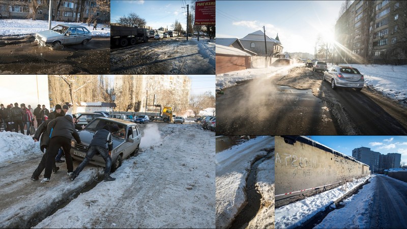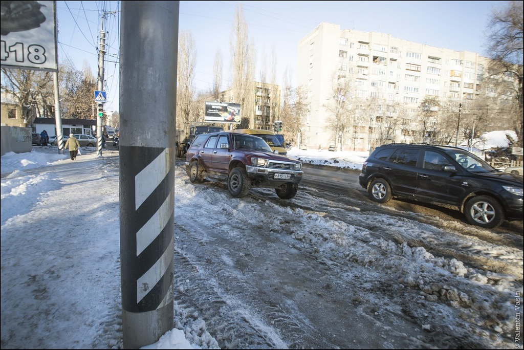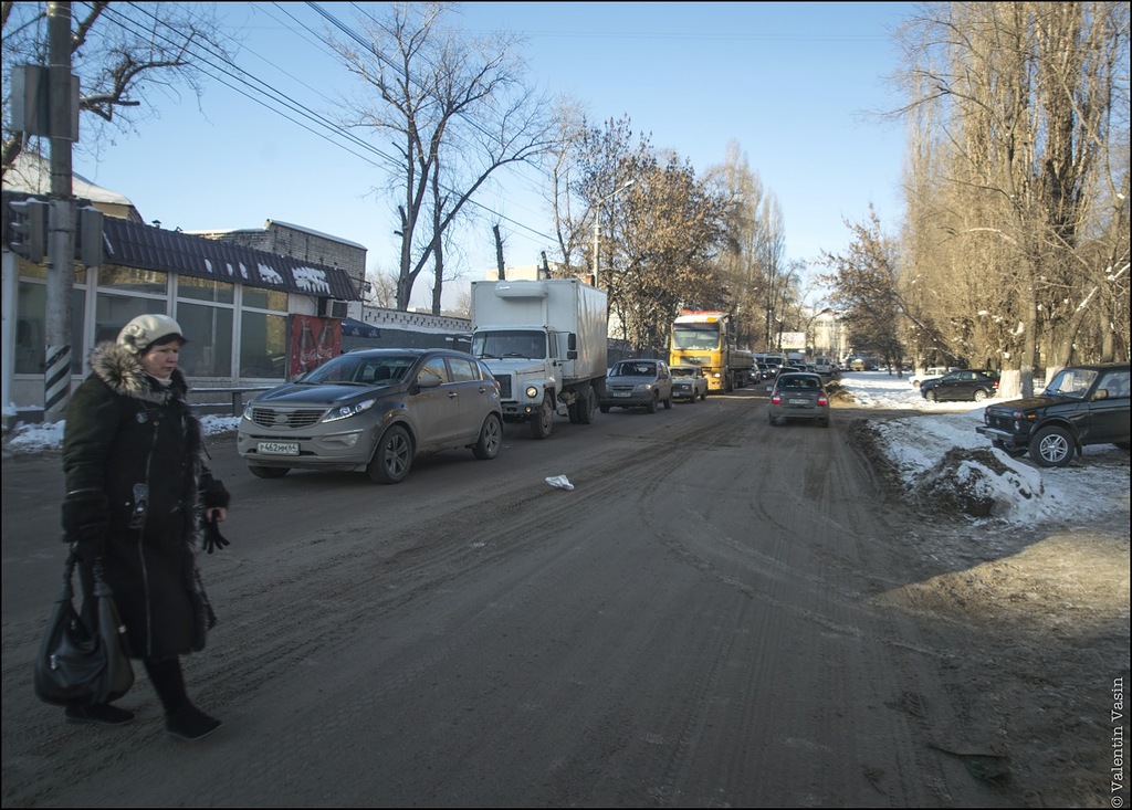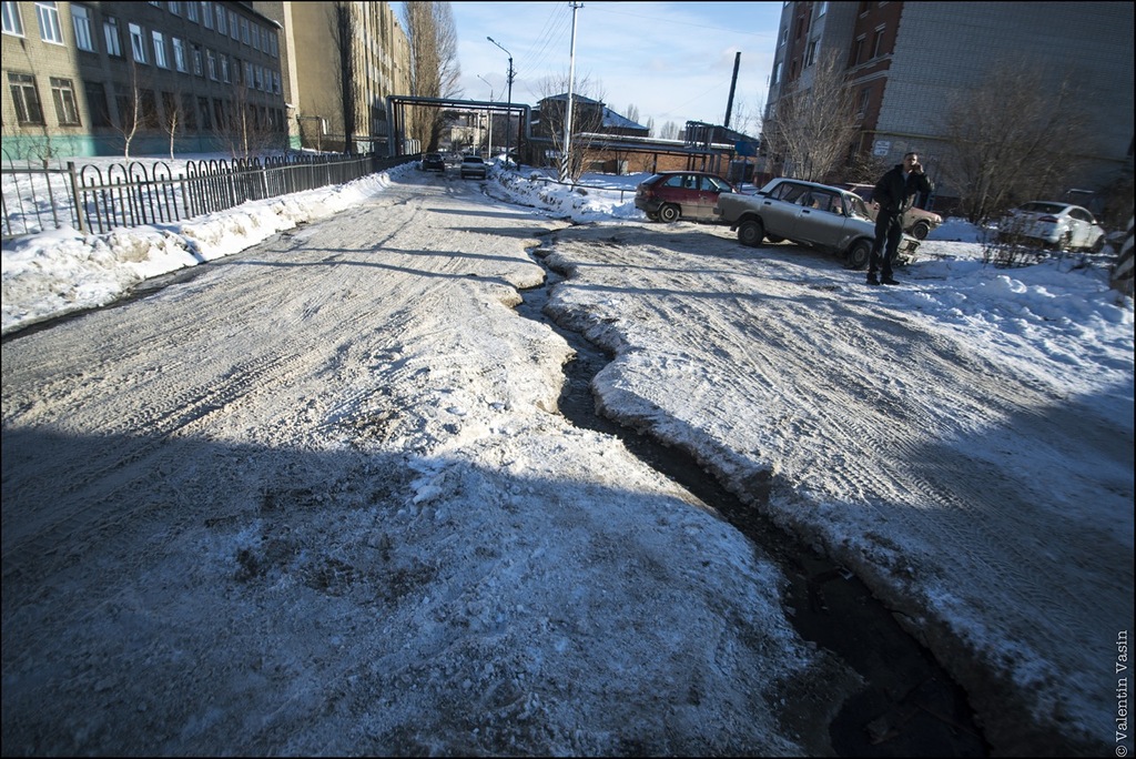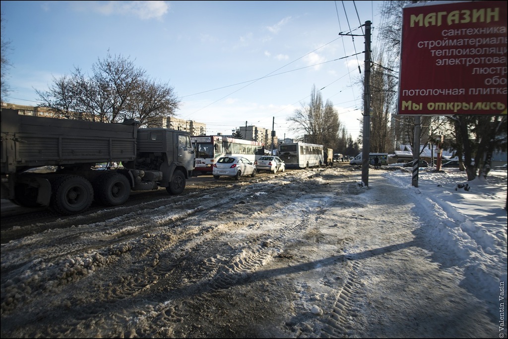 15. А это мы уже вышли на само Новоастраханское шоссе. Одна из главных дорожных артерий города. Из-за вытекшей сюда воды с улицы Миротворцева из одного маленького ручья, который власть активно не хочет спустить в канализацию, на дороге появились огромные наледи. Движение только в одно полосу. Поток огромный. Машины очень долго стоят. Стоят даже в выходные дни теперь.