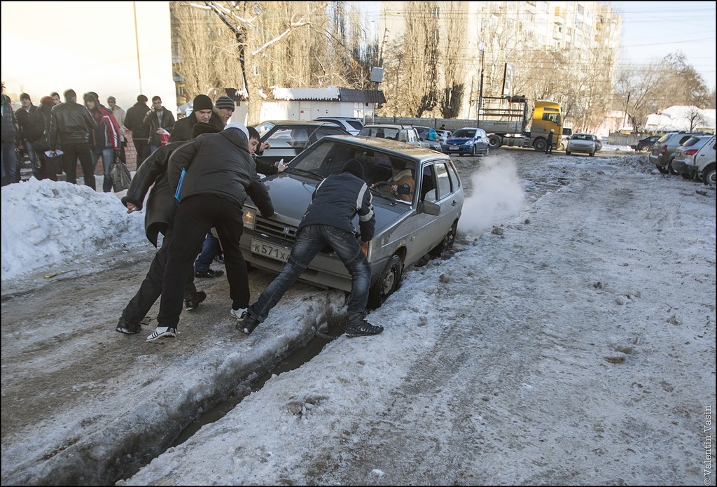 20. Студенты пытаются вытащить машину. Но села она очень хорошо.