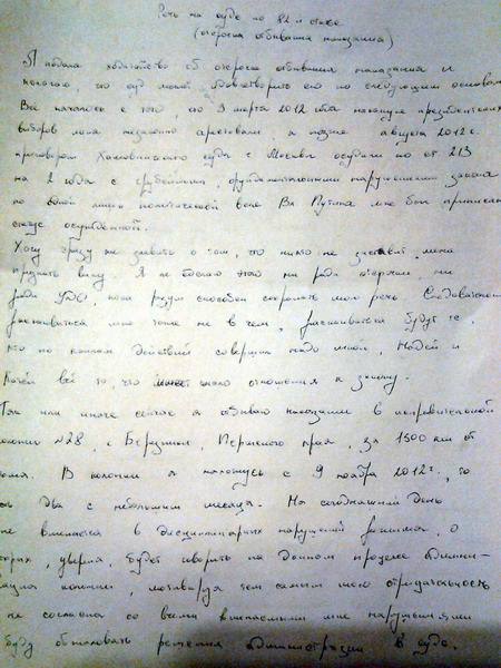 Беззаконие, бесправие, круговая порука – это вещи не просто хорошо знакомые, а привычные, очевидные в нашей стране. В них наша несвобода, которая хуже, чем свобода, как мы помним, в них наше вечное отбывание жизни вместо самой жизни. А я хочу жить, и моя свобода в том, что я стою здесь и не могу иначе (слова Мартина Лютера). Несмотря на безнадежность, моя свобода в ответственности и для меня отступить – это как немножечко умереть (а это уже слова студентов Сорбонны 1968 года). Я здесь не для того, чтобы говорить о собственной положительности, так и работать на чью-либо характеристику, в частности характеристику сотрудников полиции, считаю это чем-то унизительным, недостойным и в каком-то смысле постыдным.