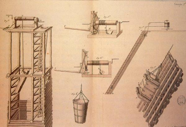 Технология подъема породы из шахты Альмагена И: Да. Альмаденские шахты были очень глубокого заложения, а их техническое оснащение – весьма допотопным. Там не было ни нормальной вентиляции, ни нормальной откачки воды – все это оставалось на уровне средневековья, и поэтому постоянно существовала угроза затопления, обрушения породы... Требовалась срочная модернизация всех систем обеспечения, и инспекция Бетанкура имела целью найти какие-то действенные технические решения в этом направлении.