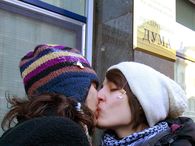 Госдума отложила первое чтение проекта, но акции все равно решено было провести. В Москве напротив здания Госдумы геи и лесбиянки в кокошниках и косоворотках планировали поддержать ценности поцелуями, сообщает "Московский комсомолец".