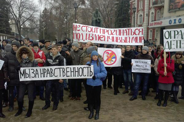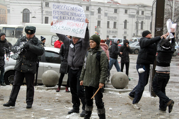 Педерасты пришли на Никитинскую площадь с плакатами "Гомофобия — это фашизм!". Представляете, что значит в Воронеже, городе воинской славы, назвать 1500 горожан словом "фашисты"? Естественно, в ответ на этот плакат в гомосексуалистов полетели снежки...