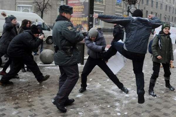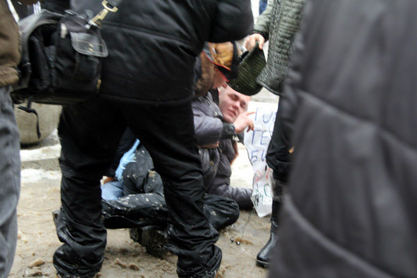 Когда участники пикета подошли к площади, их сразу сбили с ног, какую-то бабушку тоже сбили. Я не могу сказать, когда и чем били Андрея Насонова, но он потерял сознание, я его выносил на себе. Мы его погрузили в полицейскую машину, увезли, а потом пересадили в машину знакомых, которые уже отвезли его в больницу. Одному из участников разбили лоб. Дальше все было, как в инструктаже: вся площадь была занята, участники согласованного пикета стояли с самого края. Полиция площадь так и не очистила, не дала им провести пикет именно там, где было заявлено. Плакаты у них вырывали и кидали в них снежки. Периодически кто-то выбегал из толпы этих молодчиков и валил с ног пикетчиков. Девушку-участницу пикета сбили с ног. Полиция вроде вмешивалась, но никаких превентивных мер не предпринимала вообще.