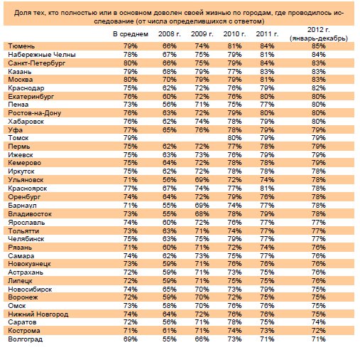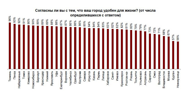 Второй день интернет несет нам льстивый поток информации про "самый лучший город Земли" (с). Теперь в формате "Тюмень — самый удобный город России". Но нигде не указано, а какую выборку респондентов опросил центр исследований компании Росгосстрах? То ли среди своих клиентов (а это, априори, наиболее обеспеченная аудитория), то ли среди своих сотрудников??? Вот вы верите в цифру 85% полностью довольных своей жизнью в нашем городе? А жителей Тарман, Мыса, старой Лесобазы и прочих нахаловок опрашивали? Значит, 85% довольны жизнью, а 96% вообще считают наш город удобным для проживания.