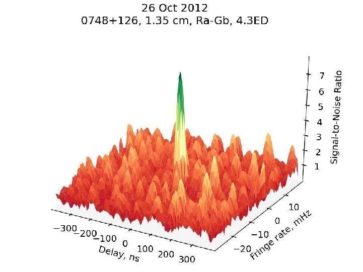 Рис. 2 (в начале новости) - Квазар 0748+126, диапазон 1.3 см, проекция базы КРТ-GBT около 4.3 диаметров Земли, отношение сигнал-шум около 8.