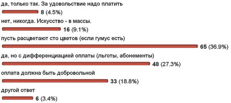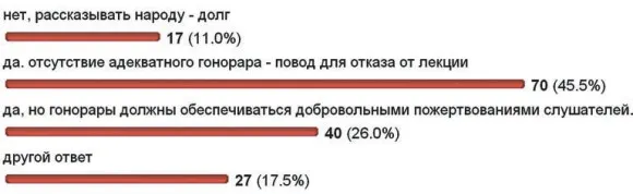 Второй опрос был связан с оплатой лекций. Вопрос звучал так: «Должны ли научно—популярные лекции быть по преимуществу платными?». Около 30% ответивших поддержали позицию, что лекции должны быть платными (допустим, с дифференциацией оплаты через льготы и абонементы). Жестких принципиальных противников платы за вход оказалось немного (около 9%), около 37% опрошенных считают, что лекции могут быть как платными, так и бесплатными, а около 19% полагают, что такая оплата должна быть добровольной. Заметная доля комментировавших высказали мнение, что за всё должно платить государство или добрые спонсоры [2]. Стоит отметить, что всего на наши вопросы ответило более 150 человек. Они оставили более двух сотен комментариев.