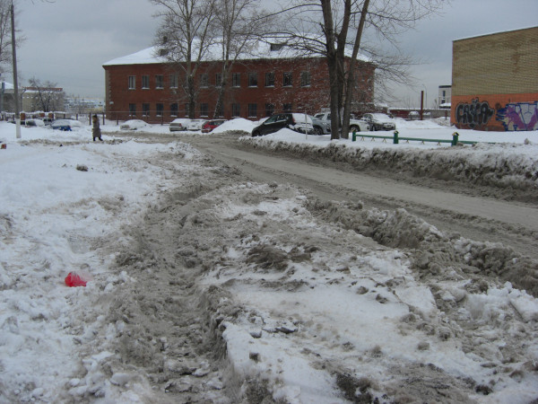 Это мой дом и прилегающая к нему дорога. Еще в прошлом году она была самая чистая в городе. Ежедневно на ней не было ни снежинки. И совсем не потому, что ее усердно чистили, даже наоборот, дворники скидывали на проезжую часть дороги снег с тротуаров, изо дня в день. Просто под ней проходит теплотрасса и каждую зиму асфальт здесь не просто чистый, но и сухой. Настоящий рай для автомобилей и водителей нашего дома, образцово-показательная парковка и так далее... Была... Но в этом году отчего-то, то ли сеть перенесли куда-то, то ли просто она не работает, в общем, дорога осталась без подогрева. А дворники, наверное, по привычке так и продолжают скидывать на нее снег. Вот что мы имеем сейчас: