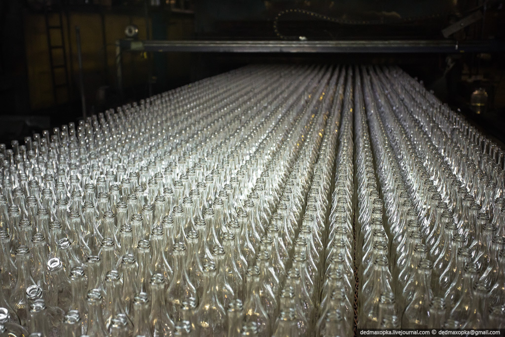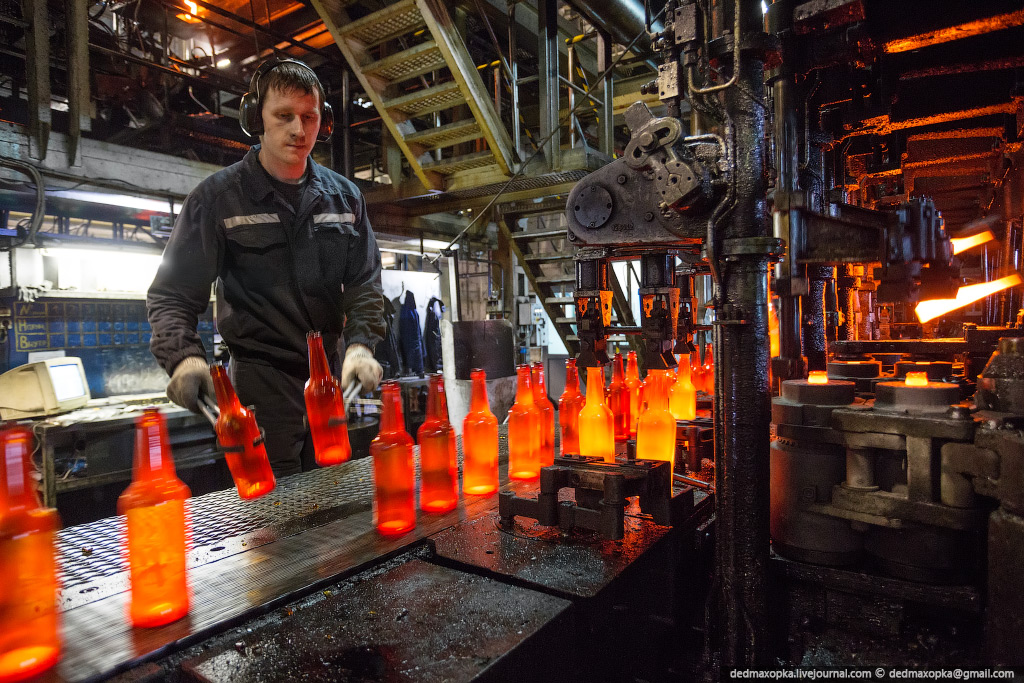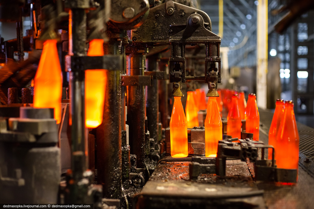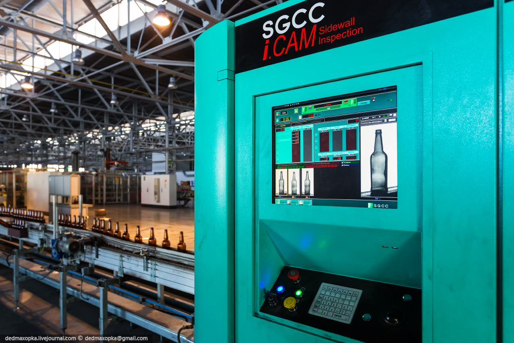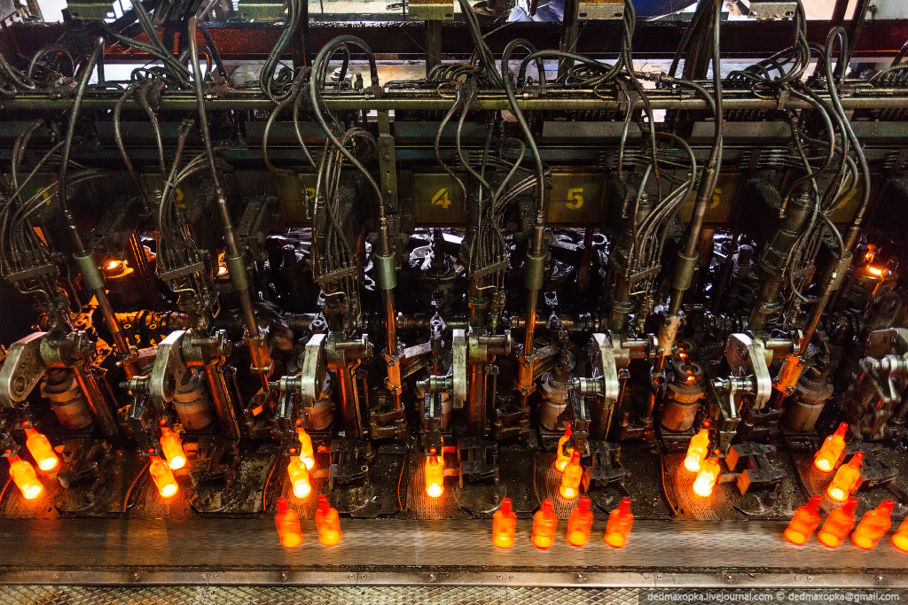 Я показал процесс изготовления бутылок на новом стекольном комплексе. Есть еще другой цех, где делают прозрачные бутылки и банки, где контроль качества производится вручную. Первые 4 и следующие 7 фотографий сняты именно там.