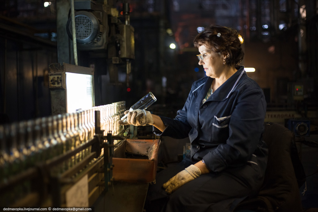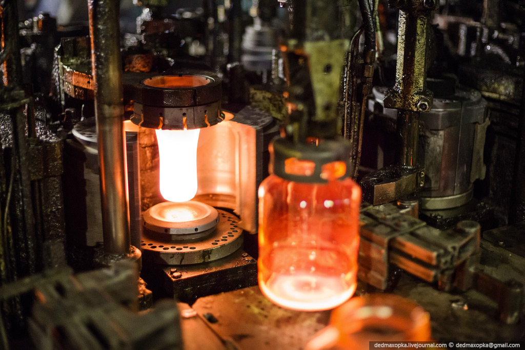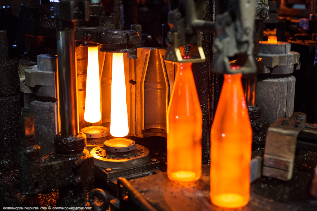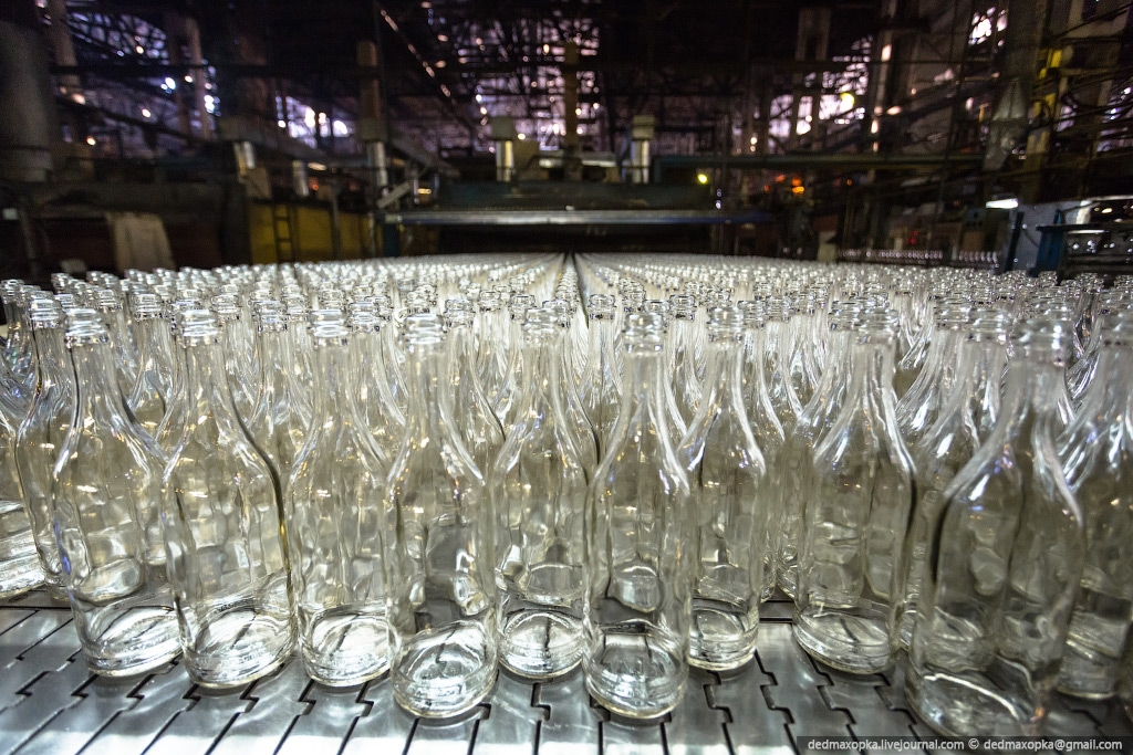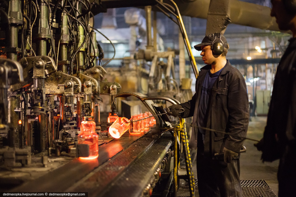 Я показал процесс изготовления бутылок на новом стекольном комплексе. Есть еще другой цех, где делают прозрачные бутылки и банки, где контроль качества производится вручную. Первые 4 и следующие 7 фотографий сняты именно там.