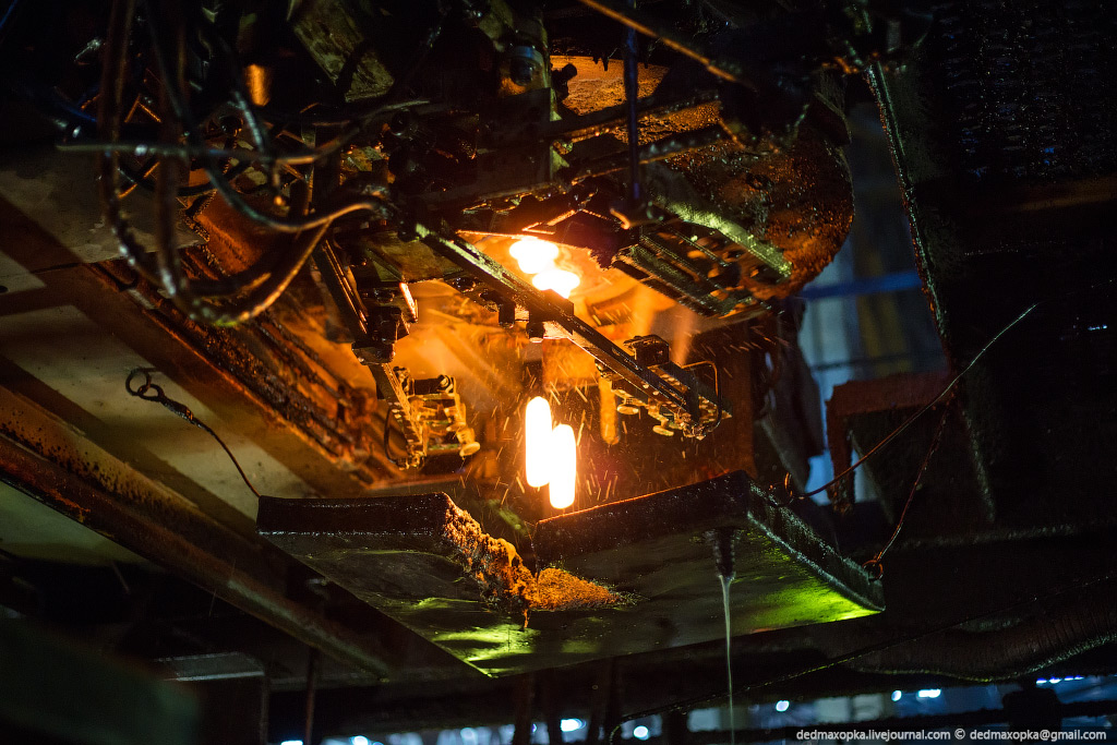8. Подача стекломассы на стекольные линии. Внизу кадра видны две падающие яркие капли стекломассы — это будущие бутылки.