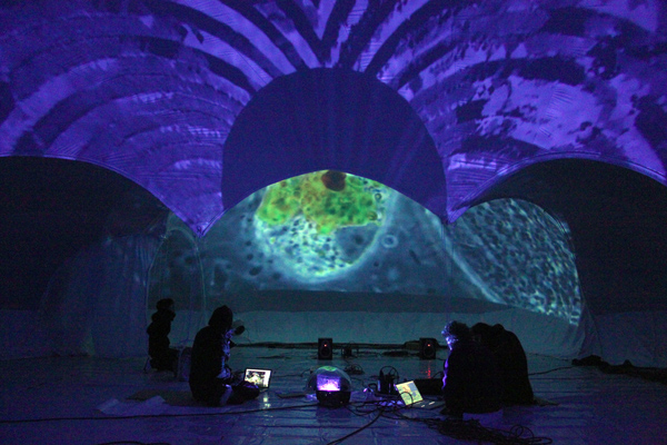 Эксперименты Г. и Д. увлекают меня и потому, что моя мама – микробиолог, и с детства я знаю поразительную красоту колоний, растущих в чашках Петри на агар-агаре. В институте ядерной физики, где мама работает, я когда-то впервые увидел магический луч лазера в сигаретном дыме. Дмитрий Гельфанд и Эвелина Домнич используют белый лазер, когда показывают полеты элементарных частиц в жидком азоте, замороженном в камере Уилсона. А, взглянув на их мыльные пузыри, художница Кокки Эйк создала надувной шатер из ткани в виде пяти полупрозрачных сфер, в которые для гонгового перформанса были вшиты 16 крошечных динамиков. Не об этих ли пузырях земли писал Шекспир?